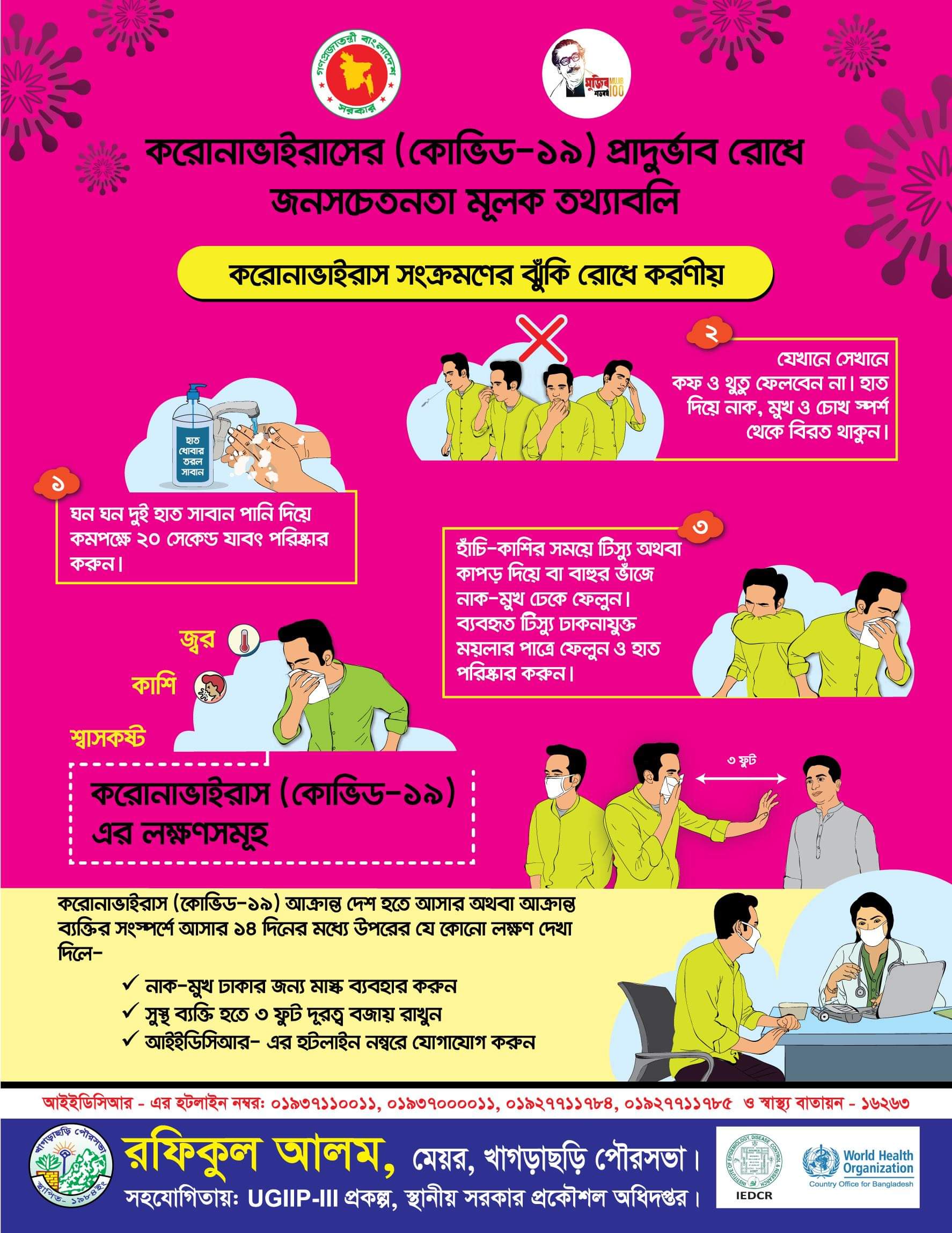 করোনা ভাইরাসের (কোভিড-19) প্রার্দুভাব রোধে জনসচেতনামূলক তথ্যাবলী ও প্রয়োজনীয় উদ্যোগ এবং করণীয় সম্পর্কে খাগড়াছড়ি পৌরসভার কার্যক্রম।